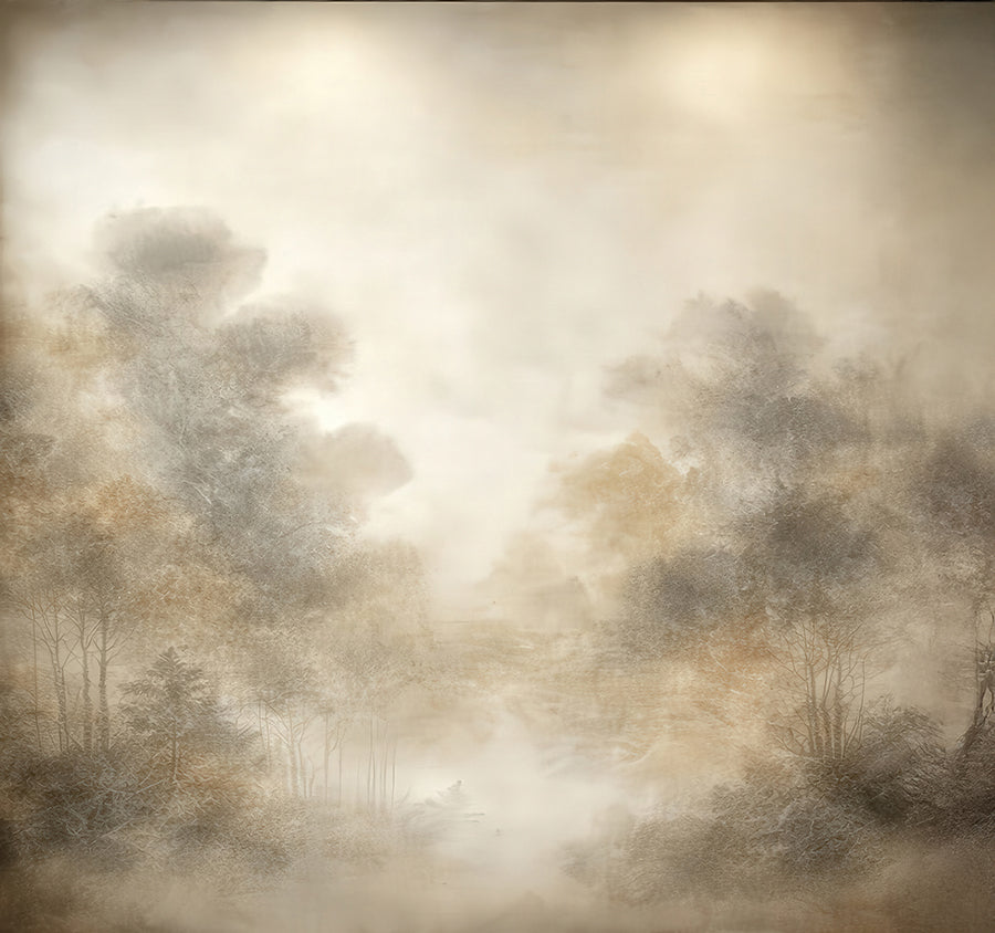 Brome is a mural depicting a misty landscape bathed in soft light, where the silhouettes of trees blend into subtle shades of beige, ochre, and pearl gray. Its soothing and refined atmosphere brings depth and serenity to any interior space.